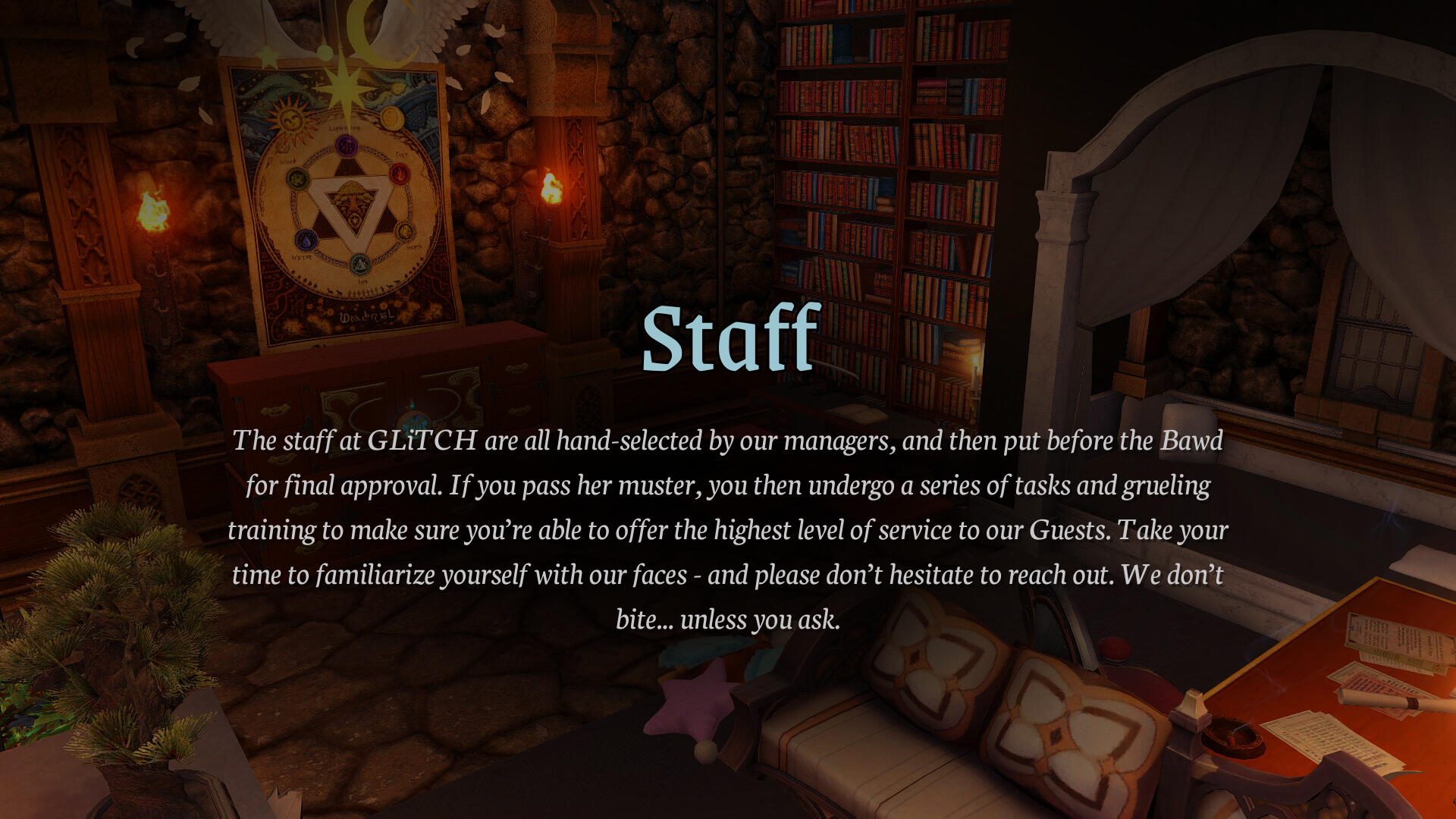 - EXPECT PUBLIC ERP. Public ERP and light scenes are allowed at our venue. IF you would like to engage in more intense or potentially 'triggering' scenes, please inform our staff so we can work out a safe environment for you to enjoy your darkest of fantasies. ♡- PUBLIC ERP ≠IMPLIED CONSENT. Consent is not implied by crossing the front door. You are not to touch or make unwanted advances to any member of staff or other guests without prior consent. People engaging in public ERP enjoy exhibitionism. They like you to watch... and it stops there.- DO NOT INTERRUPT SCENES. Again, public scenes and ERP are not free for all. If you're interested in interacting with someone currently engaged in a scene for whatever reason, consider sending a tell. Do not pester if they don't reply, they are clearly busy.If you find yourself unsure about anything at all, please don't hesitate to reach out to our staff! We are here to help and create a SAFE SPACE for EVERYONE.