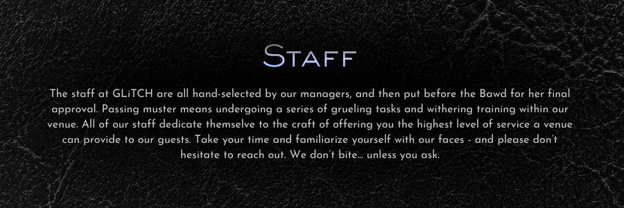 - EXPECT PUBLIC ERP. Public ERP and light scenes are allowed at our venue. IF you would like to engage in more intense or potentially 'triggering' scenes, please inform our staff so we can work out a safe environment for you to enjoy your darkest of fantasies. ♡- PUBLIC ERP ≠ IMPLIED CONSENT. Consent is not implied by crossing the front door. You are not to touch or make unwanted advances to any member of staff or other guests without prior consent. People engaging in public ERP enjoy exhibitionism. They like you to watch... and it stops there.- DO NOT INTERRUPT SCENES. Again, public scenes and ERP are not free for all. If you're interested in interacting with someone currently engaged in a scene for whatever reason, consider sending a tell. Do not pester if they don't reply, they are clearly busy.- RESPECT THE COLLAR. While it might be common place in other venues to be able to flirt with anyone you like, here if someone is wearing a symbol of devotion, we expect you to respect that. Be it a ring, a collar, a brand, or anything else -if someone is indicated as involved with someone else - ask before assuming you can behave freely with them..If you find yourself unsure about anything at all, please don't hesitate to reach out to our staff! We are here to help and create a BRAVE SPACE for EVERYONE.
