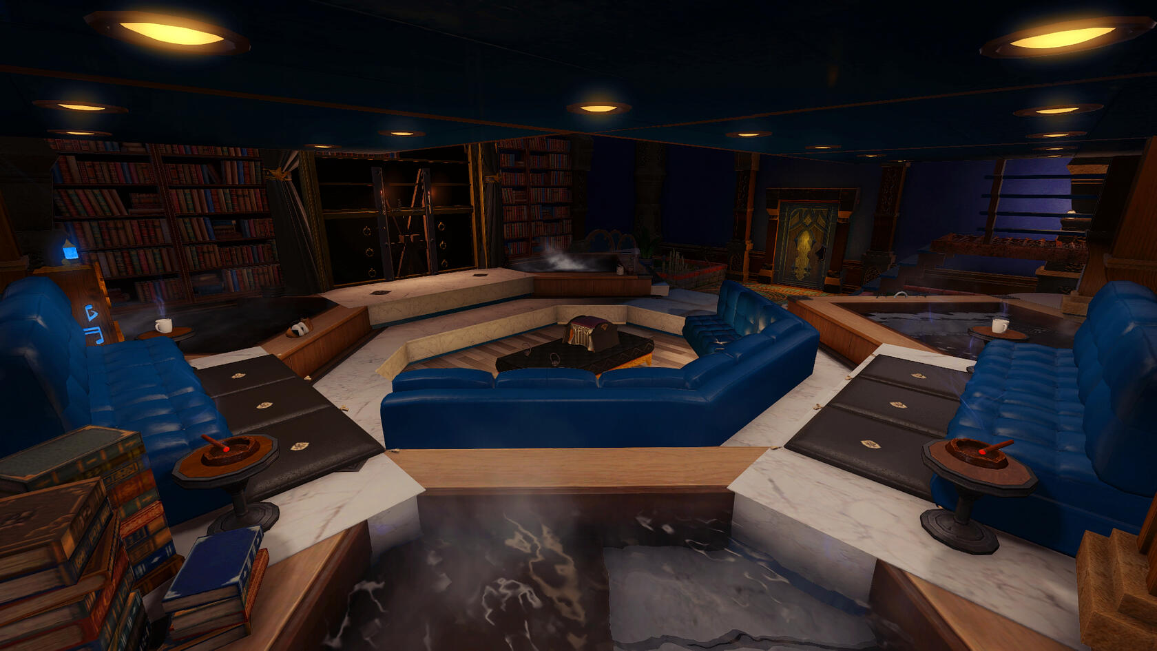 The Boss’s office is a pristine clean landscape with sweeping views from her bay window, and soft mood lighting for entertaining guests of GLiTCH. Her room offers a unique view when being thrown across the desk, and an even better one when you’re thrown in the cage beneath it. There's a tub for bathing your puppies in, and a few featured pieces of furniture for when she grills prospective clients and partners.